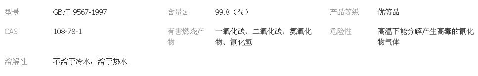 制造三聚氰胺甲醛樹脂的主要原料,用作有機(jī)元素分析試劑,也用于有機(jī)及樹脂的合成作皮革加工的鞣劑和填充劑。與甲醛縮合聚合可制得三聚氰胺樹脂,可用于塑料及涂料工業(yè),也可作紡織物防摺、防縮處理劑。其改性樹脂可做色澤鮮艷、耐久、硬度好的金屬涂料。