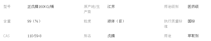 特 性:正戊腈又稱戊腈、正丁基氰、正戊腈、丁基氰、氰化丁烷,是一種無(wú)色液體,是由溴丁烷與氰化鈉制得。主要用作有機(jī)合成原料,還用作萃取劑從苯和環(huán)已烷中萃取苯。